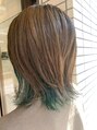 緑かかったエメラルドクリーンです。室内では緑に見えて、野外では青っぽく見えるカラーです。全体的にダメージを抑える為、酸熱トリートメントすることをお勧めします!酸熱トリートメントすることで、髪が柔らかくなり朝のスタイリングがしやすくなります。