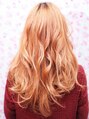 ボリューム感があるけれど柔らかいウェーブのスタイルです。のばしかけの方やロングに飽きてきた方にもオススメです。ゴールド×ベージュの上品でリッチなツヤ感がドライに見せがちなウェーブをキレイに! 顔周りの包むような動きで小顔効果も☆