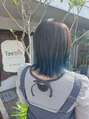 秋冬に向けてグリーンベースで染めています。中間から毛先はブリーチをして上から色を重ねています。元々、赤みのあるお客様でしたので次回も同じグリーン系で染めてもっとくすませていく予定です。ブルーの所は落ちてくるとグリーンぽくなっていきます。