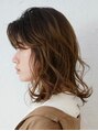 バングのセンターパートを中心に大きなランダムウェーブが映えるデザインミディ。大きなウェーブが重くならないよう、ウェットに仕上げるのがコツ。