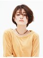 全体にゆるくランダムなカールを付けた丸めシルエットのショートスタイル。トレンドの長めバングからのぞく目が、カジュアルな色気をオン。耳にかけることでスッキリ感もキープした大人にもぴったりのスタイルです。【EARTH大曽根】
