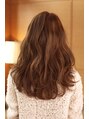 [カット]ロングレイヤーベース。表面にレイヤーを入れ、顔周りには独立したレイヤーを入れ小顔効果をプラスし、毛量調節で空気感もプラス。[カラー] 8トーンのカフェラテブラウンをワンメイクで入れ、同系色のローライトを細かく入れて束感と動きを強調。