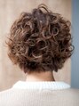 耳が隠れる長さのショートレイヤー。細めのロッドでランダムにMIX巻きにパーマをかけたスタイル。ランダムなカールを根元からかけてふわふわのボリュームと丸みをつけるのが最大のポイント。