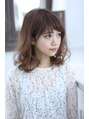 ベースは重めのローレイヤースタイル。全体に空気感が出るように間引くように軽くします。前髪はやや厚めの斜めバングにします。中間、毛先に大き目のロッドでふんわりするようにランダムにカールをつけます。カラーリングはアッシュ系のモーブな雰囲気。