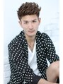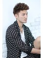 ツーブロックでメリハリを出し、ボックス状にレイヤーを入れたトップ~前髪を反り流れるようにアップバングを創る。パーマは、13~15ミリのロッドでパーパスでかけ、カラーはハイトーンのクールベージュ。グリースを使ってセミウエットな質感に仕上げます。