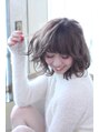 ベースは前上がりボブ。ふわぼさウェーブでアンニュイカールに。前髪は眉上のベビーバングに設定。カラーはピコトリートメント入りの8トーンのベージュ系で艶感もある美髪に◎
