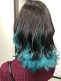 ロングのグラデーションスタイル根本地毛からの中間から毛先にかけてブルーからターコイズにもグラデーションをさせています!暗めのマニキュアを二色使って自然に馴染ませてます。デザインの相談お待ちしています!