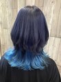 このスタイルをブックマークしてカウンセリング時にお見せください。全体を数回ブリーチしているベースにインナーのみをさらにブリーチして水色を表面は地毛と馴染むくらいのブルーブラックで染めました^_^ケアブリーチがオススメです♪