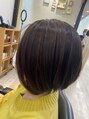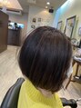 暗めに染めていた白髪染めを少しづつトーンアップする様にシークレットハイライトを入れてあります。前下がりボブの陰影ができて動きのあるスタイルになります。