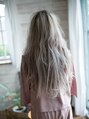 憧れロングのくしゃくしゃヘアー。ロングは特にトップがペタンとしやすいのでハイレイヤー入れてふわっとさせるのとシルエットのボリュームポイントを高くして小顔効果◎ブリーチを何回かするとこの色になります。