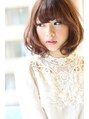 ラウンドバングのミディアムボブです。少し長めの前髪をカールさせて小顔をより小顔に。くせ毛風パーマでも、アイロンでカールさせても可愛いですよ。オレンジベージュでフレンチガーリーな印象に。