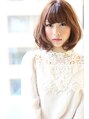 ラウンドバングのミディアムボブです。少し長めの前髪をカールさせて小顔をより小顔に。くせ毛風パーマでも、アイロンでカールさせても可愛いですよ。オレンジベージュでフレンチガーリーな印象に。