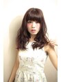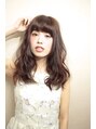 前髪のある大人っぽい雰囲気のウェーブ、スタイル。重めなシルエットのカットにふんわりウェーブを組み合わせる事により上品な可愛さのあるパーマスタイルに仕上げました。カラーリングはアッシュブラウン系で!