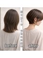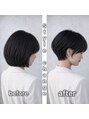 今回のお客様はロングだった髪をバッサリとボブにカット。少しクセ毛で広がりやすい髪質の方だったので、シルエットは前下がりで少し重めなひし形にする事でスタイリングしやすい、まとまりのいい髪型に仕上げました。