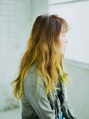 全体的を巻いて動きを出しているカジュアルなロングヘアスタイル!無造作にセットしたバングは柔らかい印象がでていてかわいいです。根元から毛先にかけて明るくなるイエローのツートーンカラーは個性的で目を引く印象的なデザインになっています。