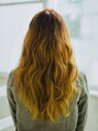 全体的を巻いて動きを出しているカジュアルなロングヘアスタイル!無造作にセットしたバングは柔らかい印象がでていてかわいいです。根元から毛先にかけて明るくなるイエローのツートーンカラーは個性的で目を引く印象的なデザインになっています。