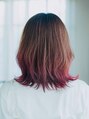 毛先にかけてピンクの発色が強くなるようにカラーリングしています。カットは顔まわりを中心に段をいれて軽さと立体感を出しています。パッツンバングにすることでガーリーな雰囲気にもなるので伸ばしかけの方にもおすすめできるスタイルです。