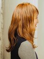 オレンジ系のブラウンカラーのシンプルなロングヘア!アシメの前髪がワンポイントになっているスタイルです。【相模原/相模原駅/学割U24/イルミナカラー/白髪染め/ケアブリーチ/髪質改善/ダブルカラー/インナーカラー/TOKIO】