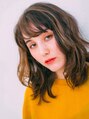 切りっぱなしラインのミディアムボブにウェーブでボリューム感のあるスタイルに☆バングをつくることで、クールすぎずやわらかな印象になるようにしています。表面をメインにハイライトをいれることで立体感や動きが出るようにしています。