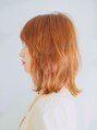 長めぱっつんボブのスタイルに表面、顔まわりにレイヤーが入った重軽なヘアスタイルです。前髪は目上ギリギリで少し流しています。カラーは明るめのオレンジベージュでツヤ感をプラス!全体をコテでゆるく巻き、崩します。ハイライト、髪質改善
