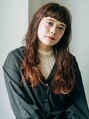 前髪ぱっつんの大人かわいいロングスタイルです。カラーは暖色系で毛先はブリーチをしてオンカラーしています。毛先にいくにつれてグラデーションカラーにしているので重たく見えがちなロングスタイルに遊びを持たせています。