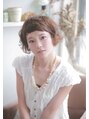 ノーズラインのショートボブ。分け目のない短いトップを中心に外人の子供のようなパーマでラフなツヤ束を♪眉上の短いマッシュバングと外にハネた毛先がポイント。ウェービーボブで脱マンネリボブ。カラーは12レベルのミルキーシフォン。ルミエールカラー。