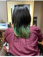 【気に入ったスタイルはブックマークしお使い下さい♪】鮮やかなグリーンのインナーからウルフ!前髪や襟足にアシンメトリーに入れました。トップは地毛を活かして。ネイビーアッシュ ウルフマッシュ 内巻きワンカール ニューヨークドライカット 緑