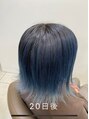 根元は暗めでのネイビーブルー。褪色過程です。褪色しても緑にならないよう調節し最後にシルバーになるように染めました。色が抜けてく過程も楽しめます