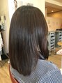 ナチュラルな厚めバングを斜めバングで横に流れるようにカット,つやつや美髪で極潤トリートメントをしっかりして、大人可愛いワンカール。似合わせカットで段をつけすぎないナチュラルミディアムスタイルです。