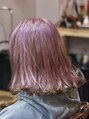 全体をケアブリーチカラー後、透け感のあるラベンダーピンクをオンカラー。毛先は裾カラーに。ダブルカラーで透明感をしっかり出しました。髪質改善トリートメントを超音波アイロンで浸透させることによって髪の毛を補修します。全体は軽さのある外ハネボブに