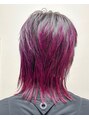 根本以外をケアブリーチカラー後、濃いめのピンクカラーをオンカラー。ダブルカラーで彩度しっかり出しました。髪質改善トリートメントを超音波アイロンで浸透させることによって髪の毛を補修し、ダメージを防ぎます。全体は軽さのあるウルフに