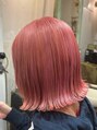 全体をケアブリーチカラー後、透け感のあるピンクベージュをオンカラー。ダブルカラーで透明感をしっかり出しました。髪質改善トリートメントを超音波アイロンで浸透させることによって髪の毛を補修し、ダメージを防ぎます。全体は軽さのある外ハネボブに。