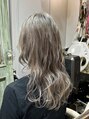 全体をケアブリーチカラー後、透け感のあるグレージュをオンカラー。ダブルカラーで透明感をしっかり出しました。髪質改善トリートメントを超音波アイロンで浸透させることによって髪の毛を補修します。全体はレイヤーを入れて軽さのあるスタイルに