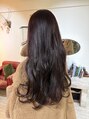 重さを残しつつ、毛先にかけてやわらかくレイヤーを入れることで、自然な動きとまとまりを両立。暗めのブラウンカラーが上品さを引き立て、光に当たると透け感とツヤが際立ちます。毛先はゆるくカールをつけて、大人っぽく女性らしい印象に。