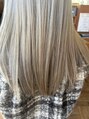 ブリーチベースに水素カラーを重ねた透明感たっぷりのスカイブルーグレージュ。水素の力でダメージを抑えながら明るさとツヤをしっかりキープできる仕上がりに。光に当たるとブルーの透明感がふわっと出てくすみすぎないクリアなハイトーンが楽しめます。