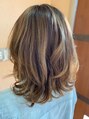 全体的にハイライトを入れてから、明るめのアッシュをのせました。巻いた時に、ハイライト効果で動きが出やすいスタイルになります。