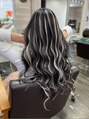 黒ベースに白のハイライトをエクステで大胆にプラス。巻いたときに浮き上がるラインがモードな印象に。コントラストの効いた配色で、シンプルなのに目を引く個性派ロング。ダメージを抑えつつアクセントを楽しめるスタイルです。