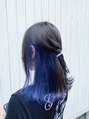 落ち着いたブルーブラックをベースに、毛先に鮮やかなブルーとパープルのインナーカラーを施したロングスタイルです。光に当たると青みや紫が際立ち、さりげない個性と透明感を演出できます。普段は隠せるため、オフィスでもOKな万能デザインです。