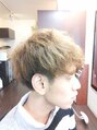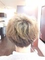 サイドをツーブロックにして、襟足部分は、かるく刈り上げに。全体にクセが強いので、クセを生かしてパーマ。