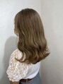 透明感あふれるイエローベージュのロングヘアは、光に当たるとさらに柔らかな表情を見せる人気のカラーです。顔周りのレイヤーカットが軽やかさを演出し、一気に垢抜けた印象を叶えます。毛先のふんわりとしたカールで、女性らしさもぐっとアップ。