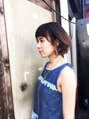 眉上バングと相性のいいミディアムボブ、カラーは、自然なグラデーションになるよう毛先は、バレイヤージュでブリーチ、後に褪色後の黄ばみを抑えるためムラサキ系のカラーをのせました。セットは、28ミリのコテで強めに巻きソフトワックスでくずしました。
