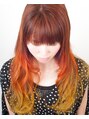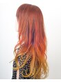 中間から根元を同じ明度にして毛先をグラデーションにする為ウェービングと毛先を色味のない色に整えその後、根元からオレンジ・毛先にイエローのマニキュアを塗り、色鮮やかなグラデーションカラーに仕上げています。日差し輝いて見えるカラーリングです!