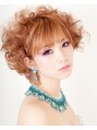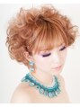グラデーションカラーでオレンジカラーと毛先のイエローが光のようにキラキラとしたあたたかさと、ドレス・ネックレスのブルーが深い美しい海のような色でまるでドールのような美しいブライダルスタイルを演出しています。