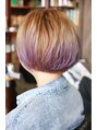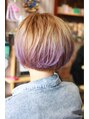 自然な丸みのボブ スタイルです。ブリーチは事前にしてあったので、毛先のみディレクションのライラックとラベンダーをMIXして、適当に塗布。絶妙なグラデーション感を出すのがポイントです。