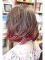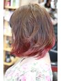 人気のハイブリッドカラーです!毛先部分にディレクションのカラーで個性を演出するカラーリングが人気上昇中です!!ブリーチはしないで挑戦できるのが特徴です。ベースカットは長め前下がりボブ。根元にたっぷり間引きを入れて動きを出します。
