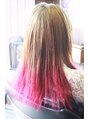 内側にディレクションのカーネーションピンクとフラミンゴピンクをMIXして入れました。トップはブリーチ後に、ミントアッシュとアジャストグレイで外国人風に。