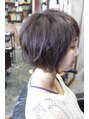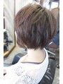 前回のパーマを活かしてのカットデザイン。自然な動きと涼しげに見える印象にカットでつくっています。前髪はアシメにしています。カラーは白髪も染まる艶感パールカラー。