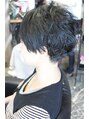 あえてのブルーブラックで艶ブラックを目指したベリーショート。顔周りはストレートを残して、バックは癖を活かしてくしゃくしゃに仕上げています。襟足はかりあげ寸前、サイドはツーブロックに。