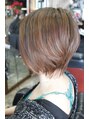 前下がりでバックにボリュームの出せるショート。カラーはモーブにローライトをプラスしたお任せ似合わせカラー。雰囲気を大切にしたデザインお任せ下さい!