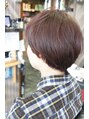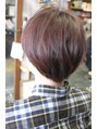 前髪短めのマッシュショート。カラーはルビーレッドとラベンダーのMIX。艶感と自然な毛流れを意識してデザインしました。